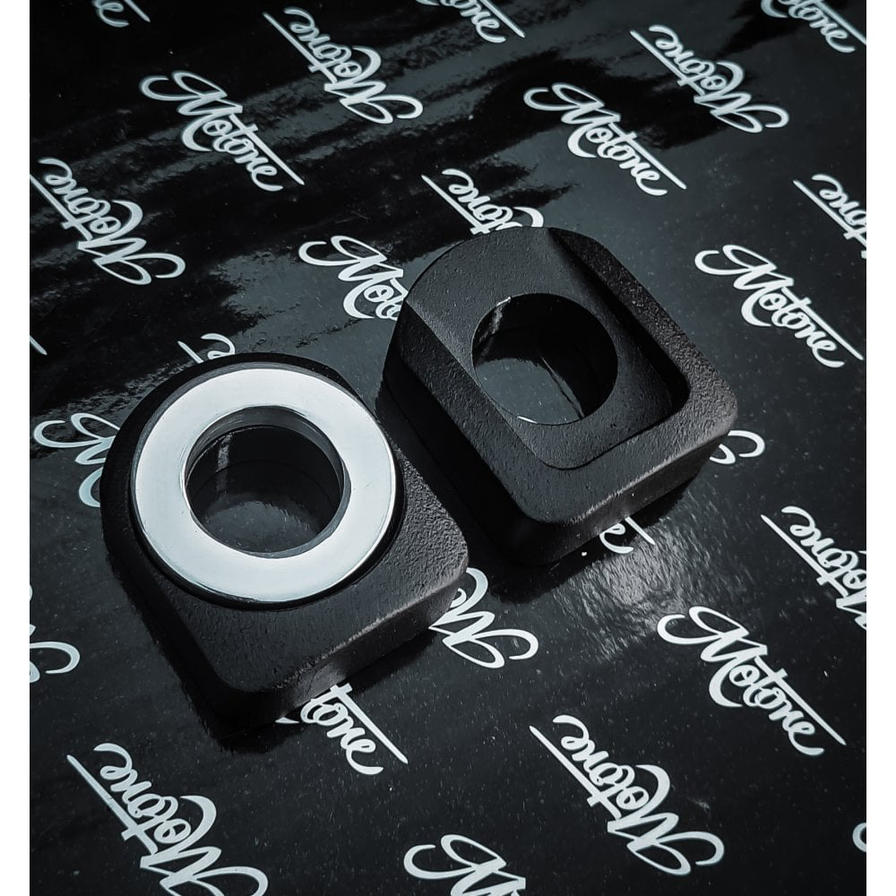 Il kit blocco di regolazione della catena in alluminio forgiato di Motone è forgiato in alluminio e verniciato a polvere nera con una rondella lucidata.