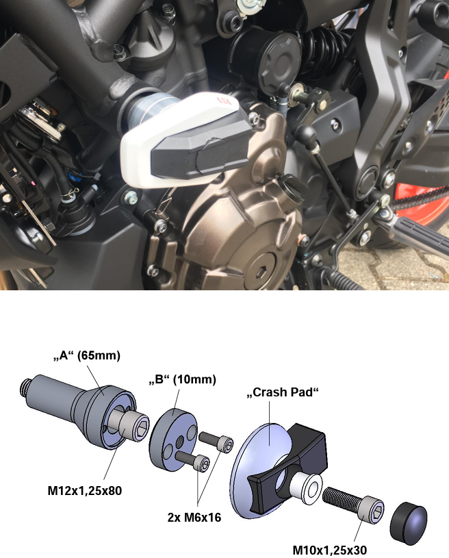 LSL CRASH PAD® mounting kit (DS), directly bolted to the frame with engine retaining bolts.