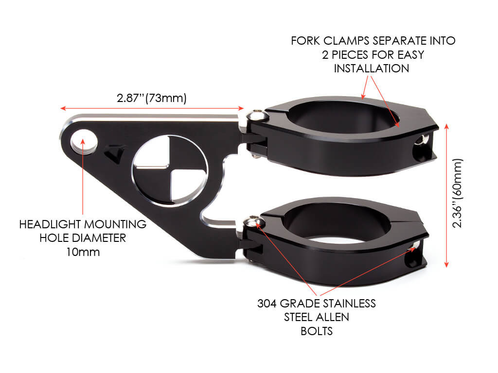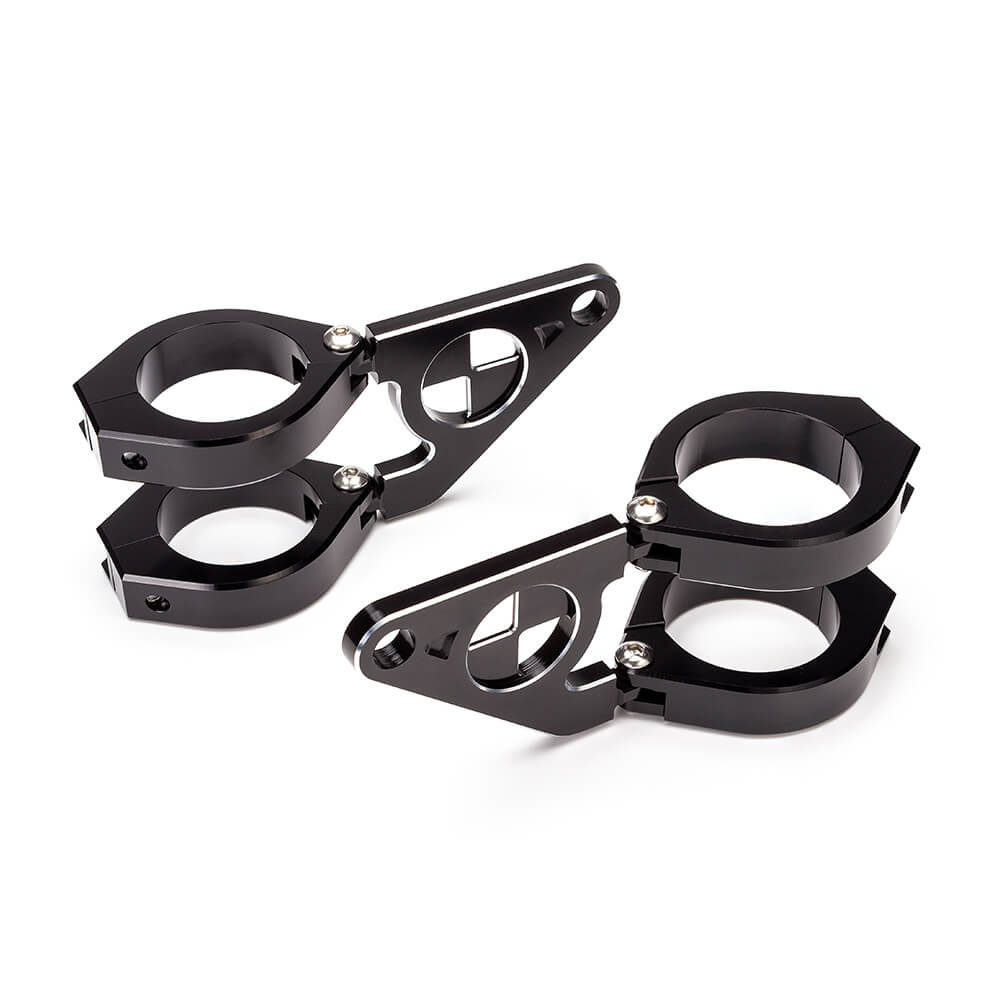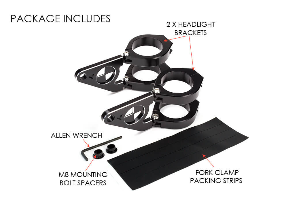 Each fork clamp comes in 2 separate pieces, allowing them to clamp onto the forks down without having to remove them from their yokes.
