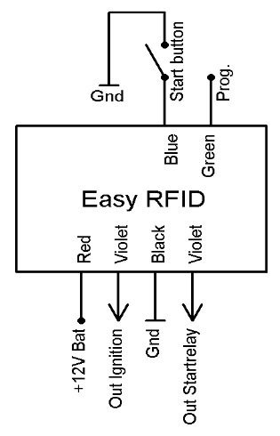 This easy RFID works with only one button. One press on the start button will activate the transponder module what looks for a key. The module will activate the ignition output if an identified key is beside the module area.