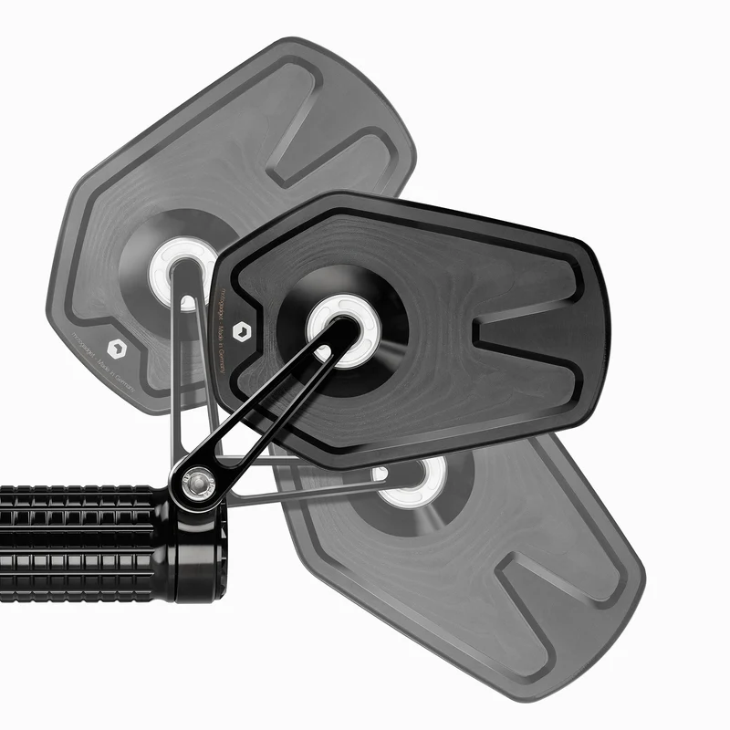 Il corpo dello specchietto, il braccio dello specchietto e il morsetto per l'estremità del manubrio sono fresati dal pieno in alluminio su macchine CNC e anodizzati con un'elevata qualità. Tutte le viti sono in acciaio inossidabile. Il giunto sferico di precisione consente una regolazione comoda e molto stabile dello specchietto. La rottura o la caduta del vetro sono semplicemente impossibili!
