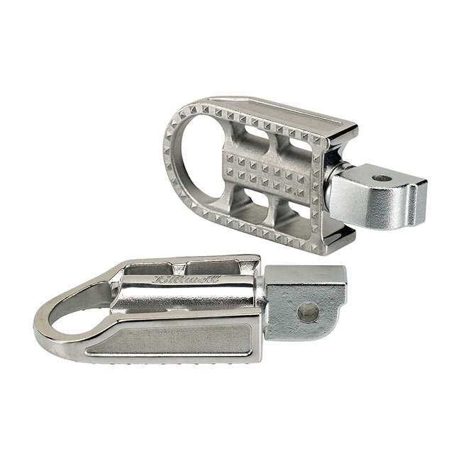 Polished or black. Investment cast stainless steel footpegs and build to last a lifetime. The clevis is made from 4130 investment-cast chromoly and will allow to rotate the peg into the perfect riding position. Note: Drop some Loctite on the clevis shaft and socket shaft before bolting everything down after rotating the footpeg in the perfect riding position.