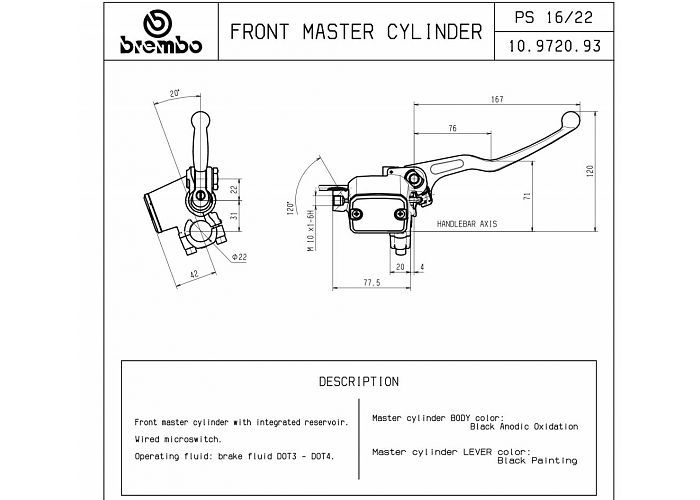PS16 Master Cylinder with Alu Lever. Piston diameter 16 mm, so for 2 discs.