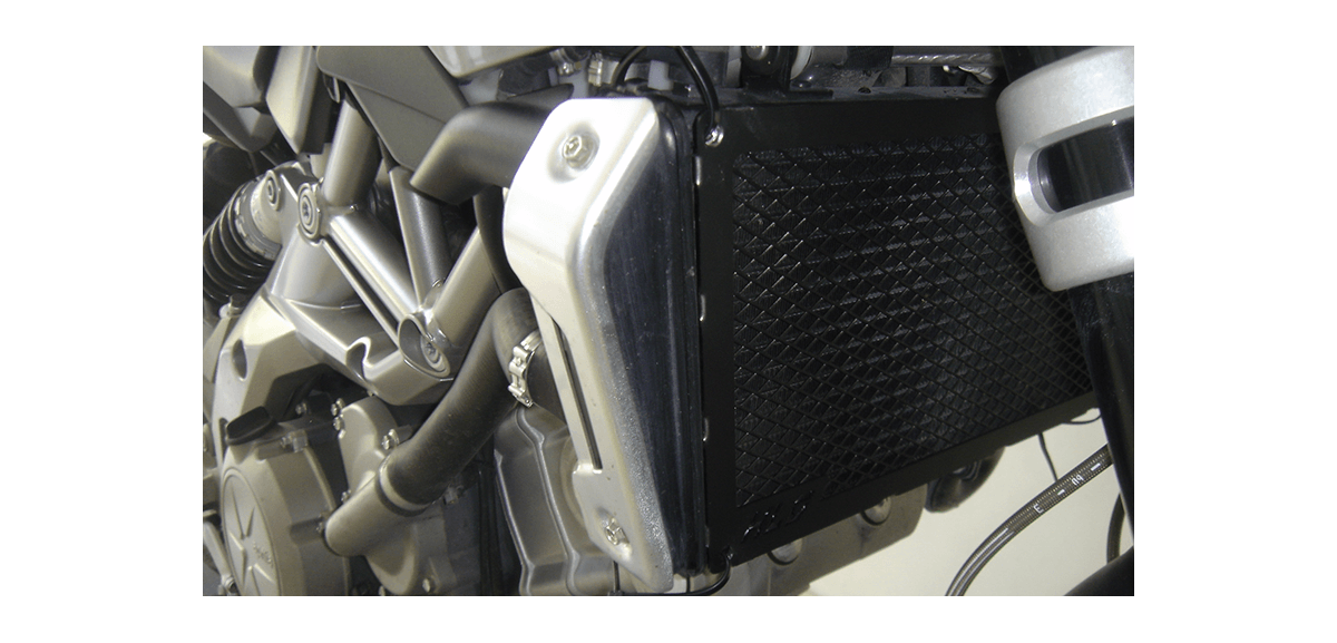 Radiator Grill for Aprilia Shiver 750. For Aprilia Shiver 750, the engine radiator protects against stones and other objects, in addition it provides protection during washing with water pressure. The grill is made from 1.5mm DCP sheet metal and aluminum grille.