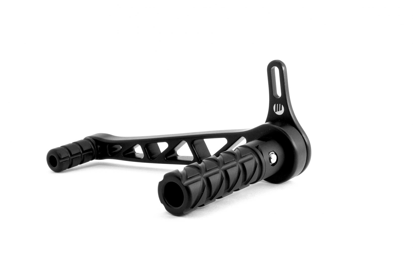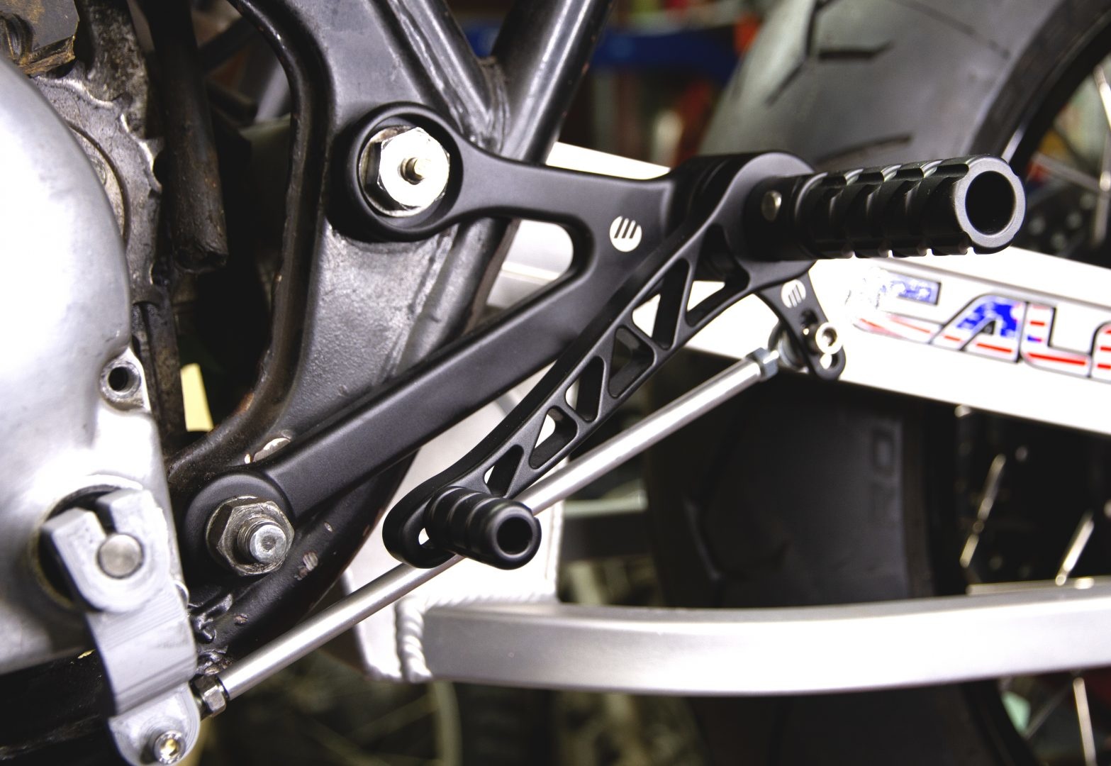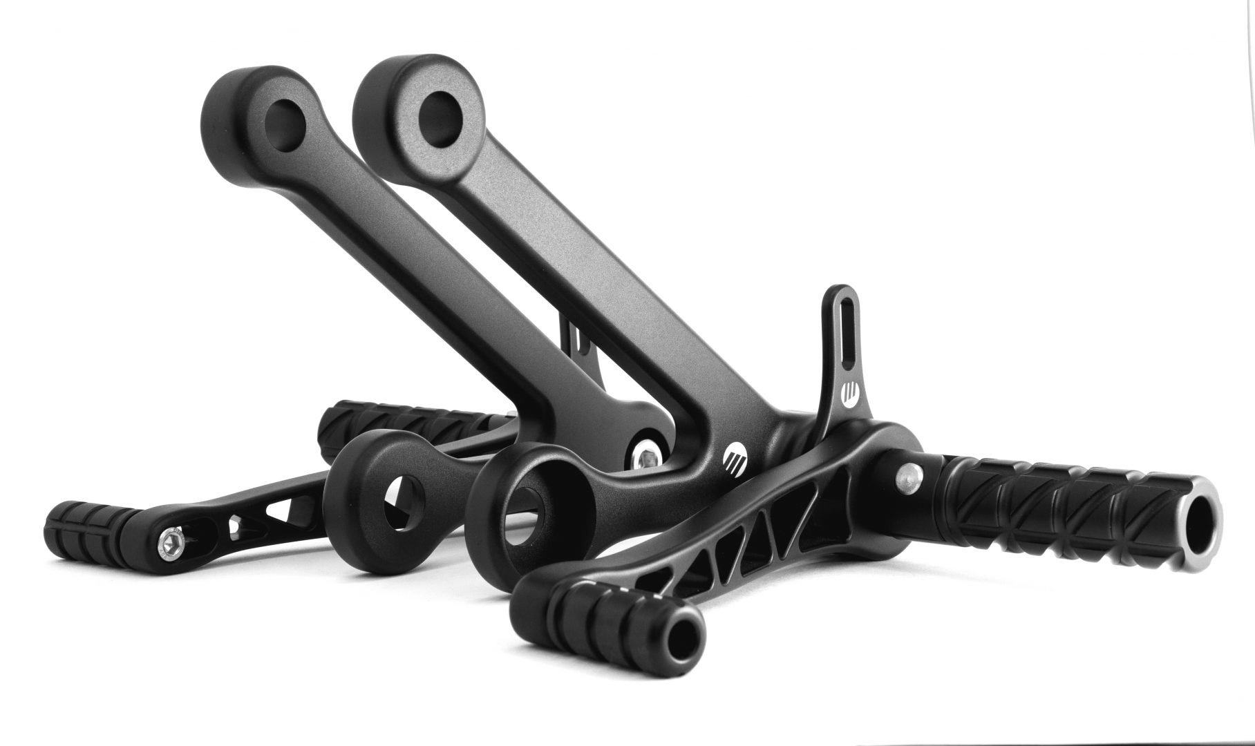 MessnerMoto Rearsets come in HARD Anodized Black finish. Each component of our Rearset is CNC machined from billet, aircraft grade, 6061-T6 aluminum. Foot levers pivot on triple ball bearings for an incredibly smooth action. Index-able arm for added flexibility. Offset on lever adds much needed clearance to clear brake arm and shifter arm.