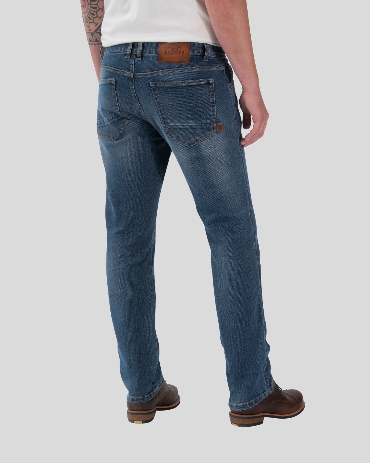 Jeans biker monostrato con cinque tasche e cerniera molto resistenti all'abrasione.