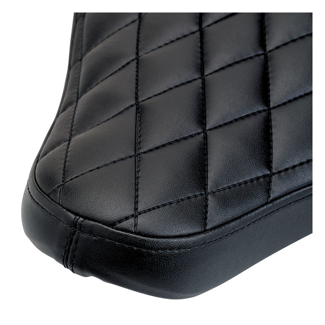 Nero. Con rivestimento in vinile resistente a punto diamante, cucito con fili di poliestere. La seduta è in acciaio stampato per impieghi gravosi con finitura galvanica nera lucida. Un leggero rialzo nella parte posteriore e una sezione del muso ricurva ne fanno un classico sedile monoposto chopper azzeccato. Il sistema di bulloni a testa tonda è regolabile, consentendo una maggiore flessibilità di installazione.