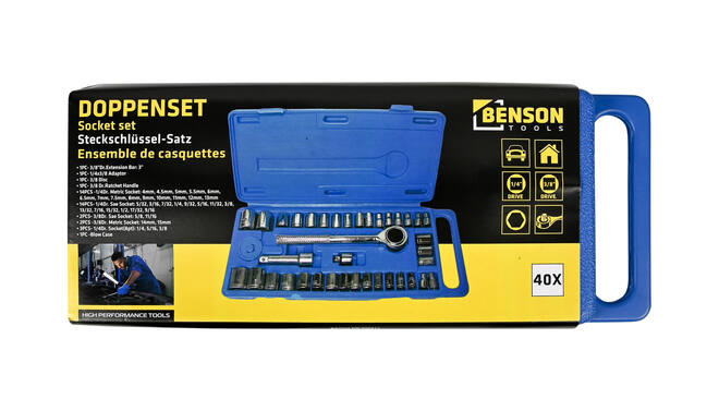 Perfetto per riparazioni automobilistiche, manutenzione domestica e lavori meccanici, il set di chiavi a bussola da 40 pezzi Benson Tools è un'aggiunta essenziale a qualsiasi cassetta degli attrezzi.