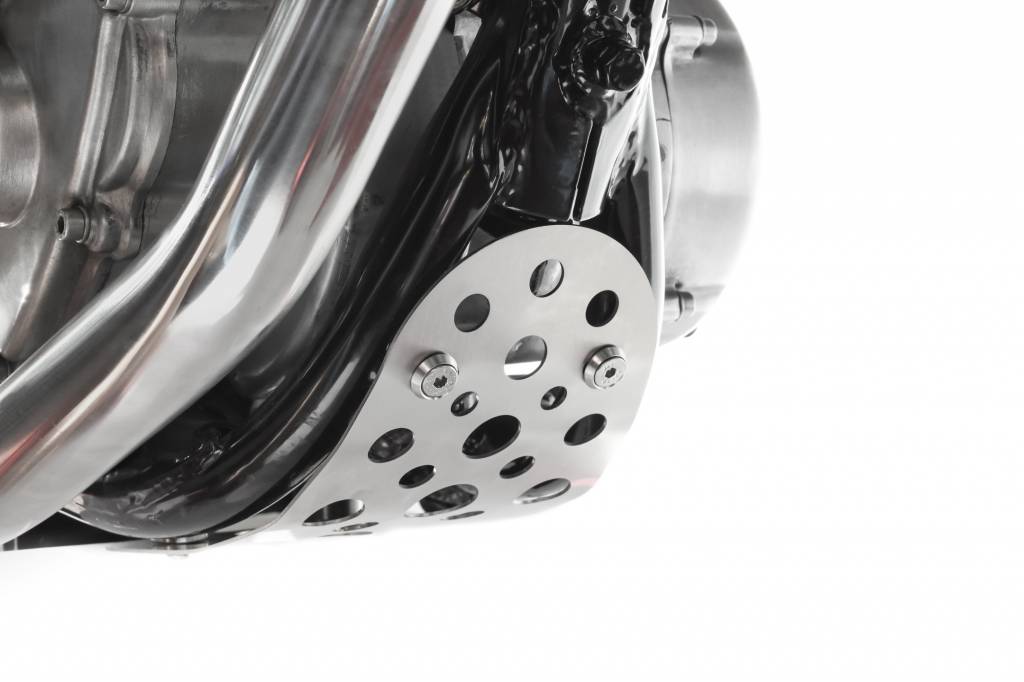 Plug and Play. The original engine guard can simply be unscrewed. Then your new custom part is attached in reverse order. Between the posterior attachment and engine guard, the supplied aluminium spacer sleeve is also mounted.