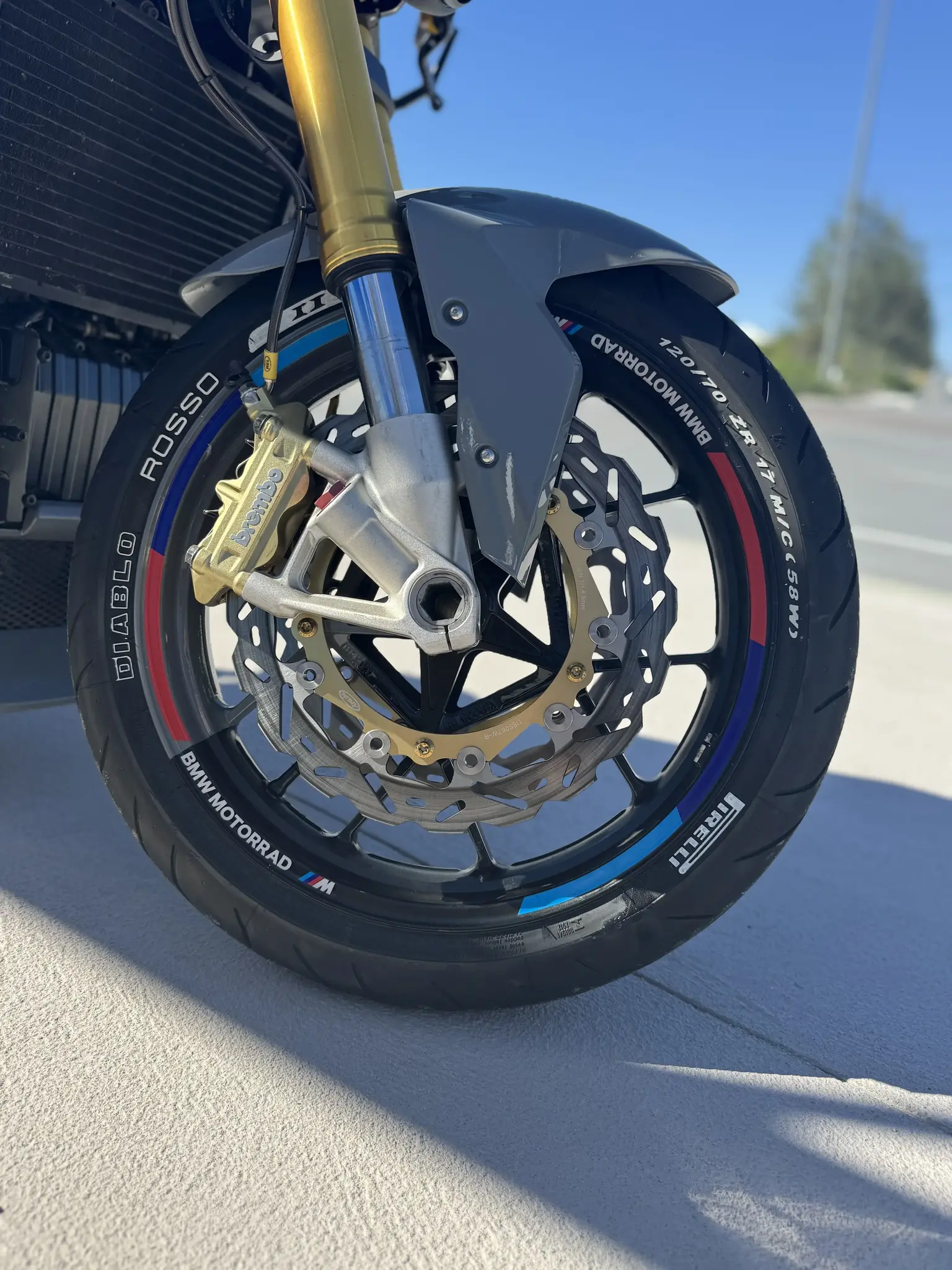 - S1000RR-voorwiel met Brembo-remmen, lichtgewicht Arashi-wiel (speciaal gespoten in de kleur van de motor), Arashi-schijven en titanium bouten en gevlochten HEL-remleidingen