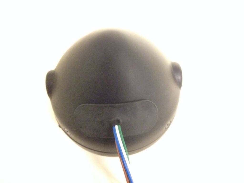 Koplamp met parkeerlicht en verstelbare binnenring, matzwarte metalen behuizing, H4 12V 60/55 W, zijmontage, E-gemarkeerd. Afmetingen: kastdiameter: 165 mm, totale diepte inclusief gebogen glas: 145 mm, laterale opname M8. Behuizingsdiepte van bevestigingsgaten aan de middenzijde aan de achterkant, ongeveer 75 mm. Kabeltoewijzing: zwart = parkeerlicht op de grond; bruin = positief parkeerlicht, wit = dimlicht, grootlicht = blauw, groen = aarde.