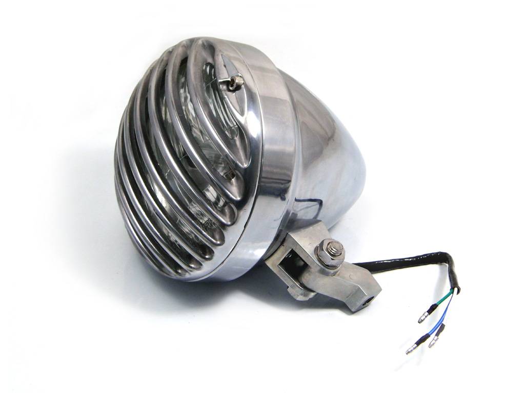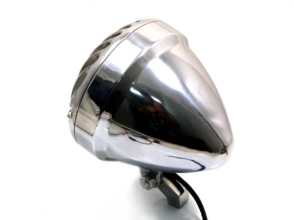 6" Prison Koplamp Bottom Mount Chrome. Zeldzaam gave lamp die perfect op de wat grotere motorfiets past door z'n forse diameter. De behuizing is metaal en er zit een H4 lamp in!