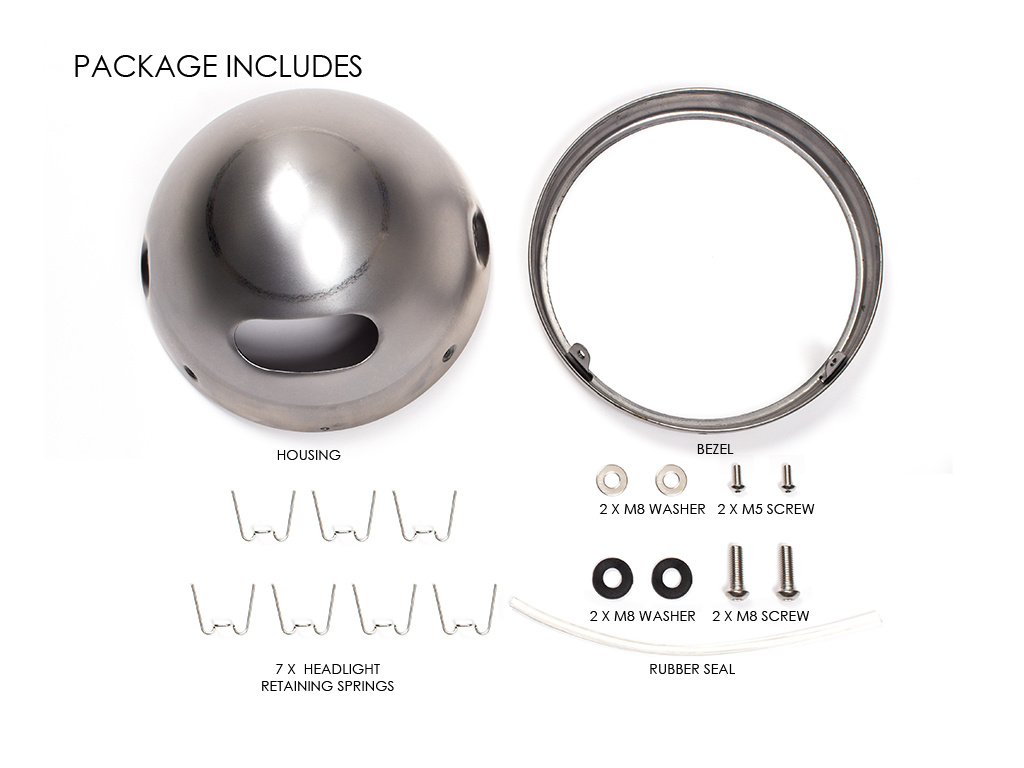Alles wordt geleverd in deze set, afgezien van de koplamp insert. Elke 7-inch LED-koplamp, verzegelde straal of semi-verzegelde straalkoplampinzet past in deze behuizing en kan op zijn plaats worden bevestigd met de meegeleverde borgveren.