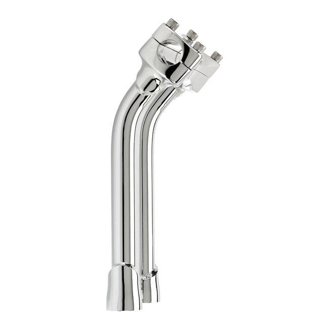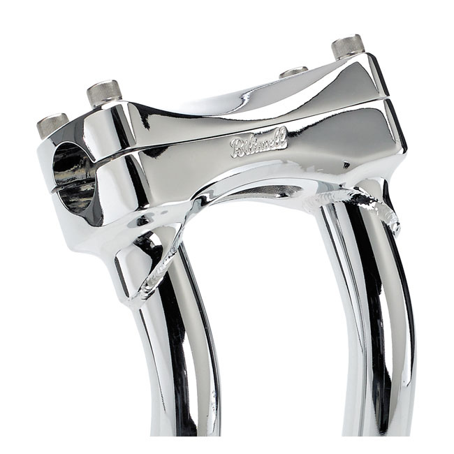 - Stijgbuizen zijn gemaakt van 3 mm dikke, naadloze, TIG-gelaste 4130 chromoly buizen met 1/2-13 montagegaten met schroefdraad die geschikt zijn voor standaard stijgbouten. 3-1/2" (89 mm) tussenruimte voor de meeste HD top triple trees.