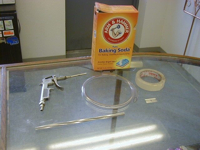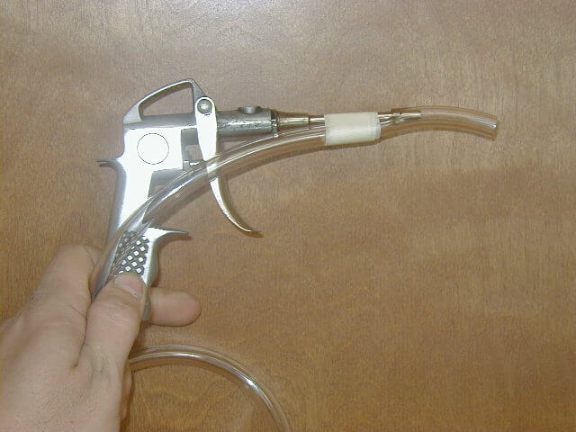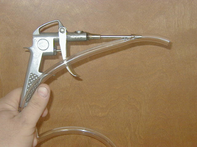 Zorg er vervolgens voor dat je met je tape, welke dat ook mag zijn, je het pistool vastmaakt aan de slang. Let wel op dat het uiteinde van het pistool iets aan ruimte heeft in de buis, want doordat de lucht er hard uit zal gaan blazen, trekt ie het baksoda mee. Zou dit uiteinde strak zitten in de slang; dan komt er niets langs en blijven je cafe racer onderdelen lekker vies!