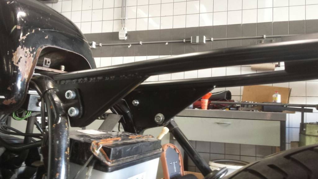 Dit frame is anders dan de meeste subframes die je ziet bij een BMW R80 Cafe Racer of Brat. Niet die "driehoek", maar een zwevend frame met de nodige steuntjes.