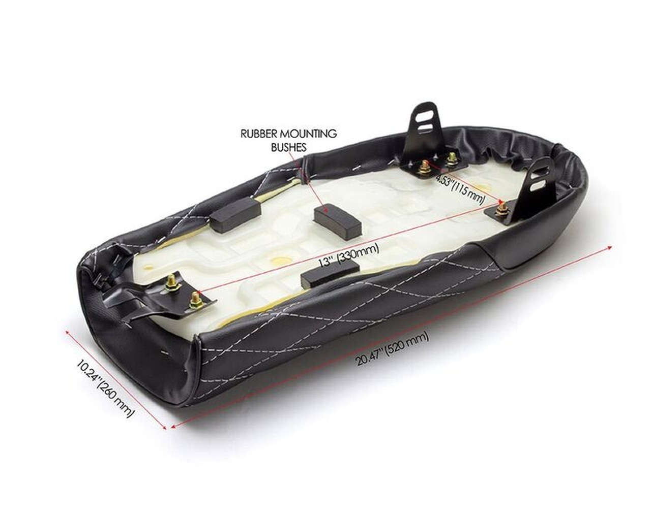 Brat Seat Diamond (zwart of bruin). Deze zadelmontage is ontworpen om je fiets een coole retro-look te geven. Het is gemaakt met hoogwaardig schuim en is bedekt met een A-kwaliteit kunstleer materiaal en kan achteraf worden gemonteerd op de meeste caféracers, scramblers en brat-motoren. Deze stoel is zeer comfortabel en past bij kieskeurige kopers, waardoor het een briljante DIY-upgrade is.