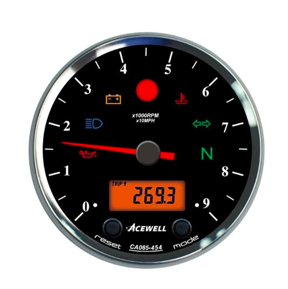 Zeer complete teller van Acewell met zwarte rand en behuizing. In feite is het een kilometerteller en toerenteller in een. Het toerental wordt analoog weergegeven en de snelheid digitaal!