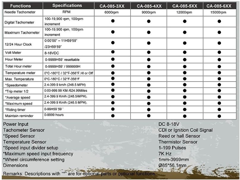 De CA085 is voorzien van diverse functies, zoals o.a. digitale weergave Snelheid, gemiddelde snelheid, voltmeter, klok, dagteller en totale kilometerstand. Dit wordt weergegeven op het digitale schermp van de teller. Daarnaast beschikt de teller over de volgende functielampjes: