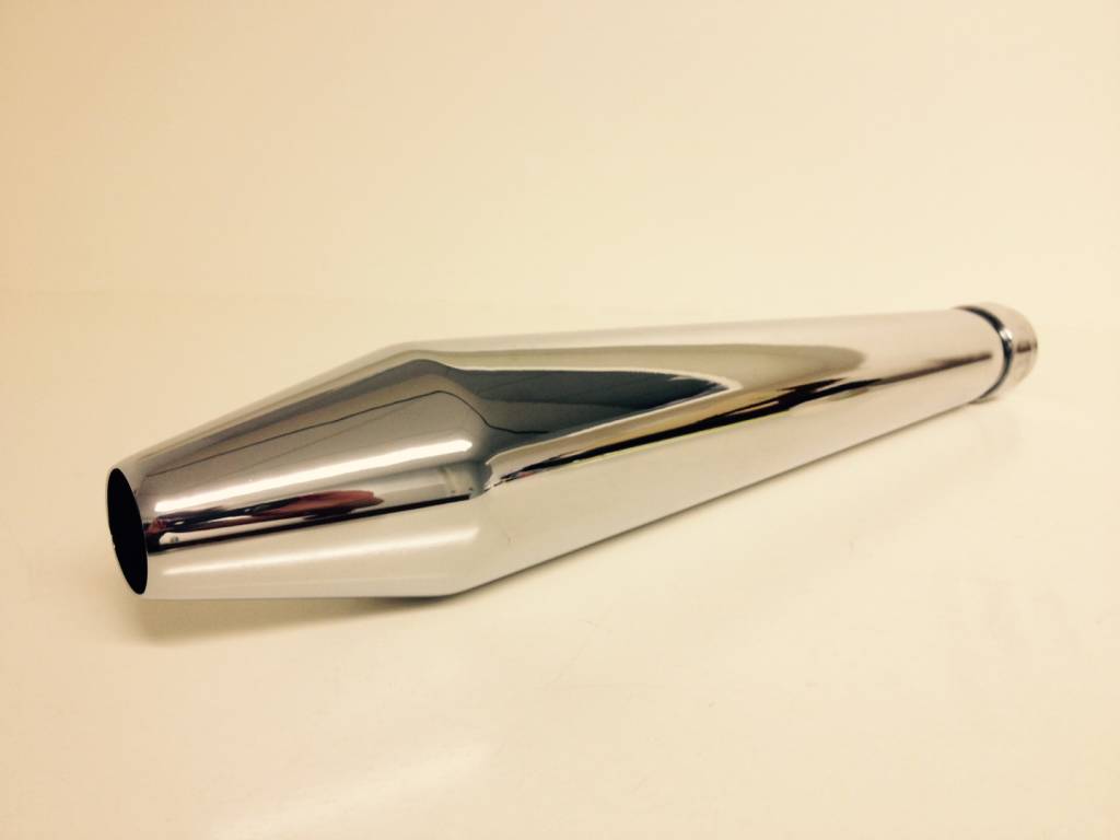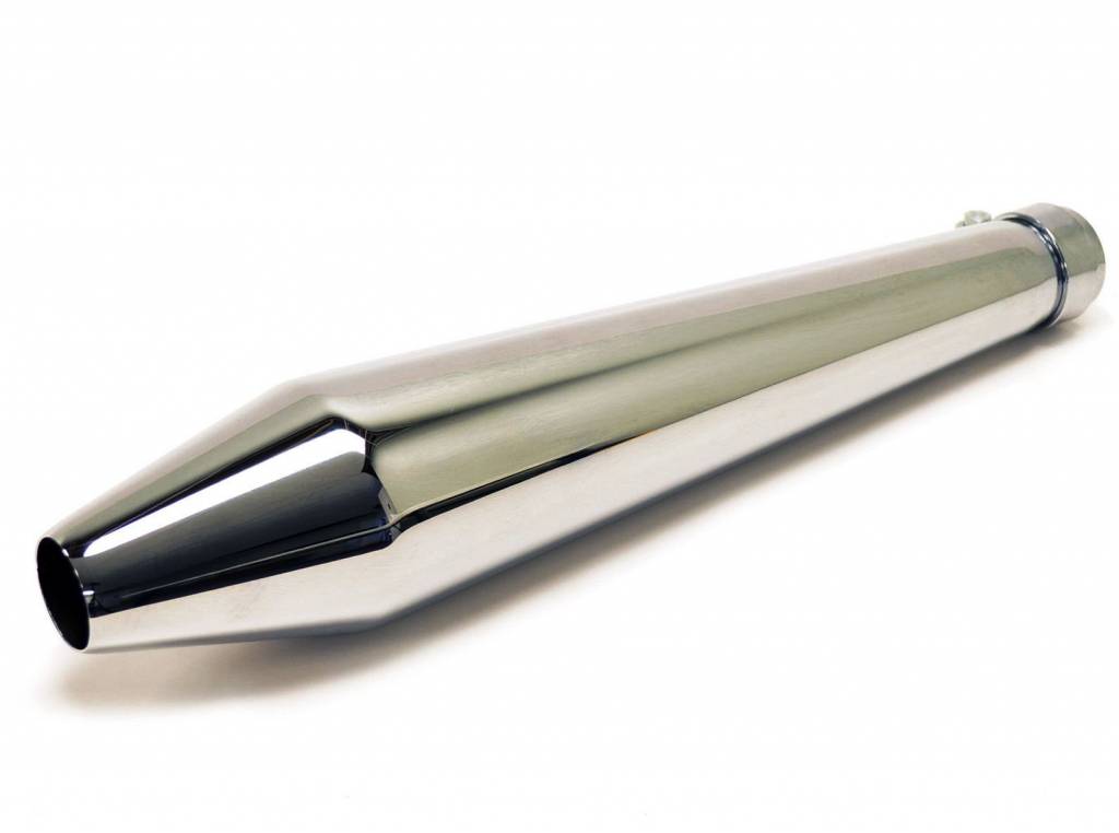 Universal Chrome short Hooligan style megaphone silencer. 19" long with variable inlet from 1-1/2" to 1-3/4".
