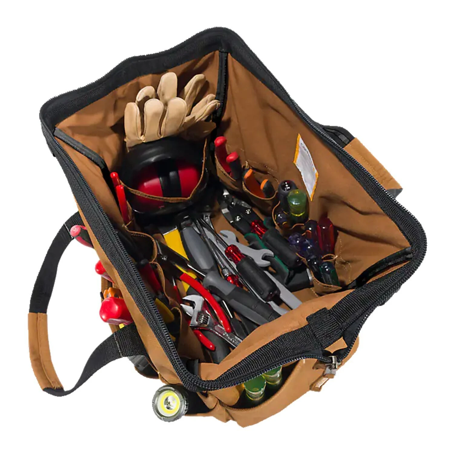 Deze Carhartt gereedschapstas is gemaakt voor duurzaamheid en efficiënte organisatie op de werkplek. Gemaakt van robuust Duravax™ polyester met een waterafstotende afwerking, beschermt hij je gereedschap bij lichte regen. Het gestructureerde ontwerp met een metalen frame en meerdere vakken maakt het gemakkelijk om al je spullen op te bergen en er snel bij te kunnen.