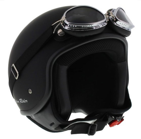 Custom Rider Matzwarte Jet Helm. Deze ECE 22.05 gekeurde Jet helm is echt een meesterwerkje. De helm heeft anti allergische binnenvoering, een snelsluiting en komt met een gratis, losse retro bril voor die echte retro look. De helm heeft een uitstekende pasvorm en hoogwaardige kwaliteit. Daarnaast is de helm nog uit te breiden met een losse helmklep of leren strip aan bovenzijde. Leverbaar in de maat M.