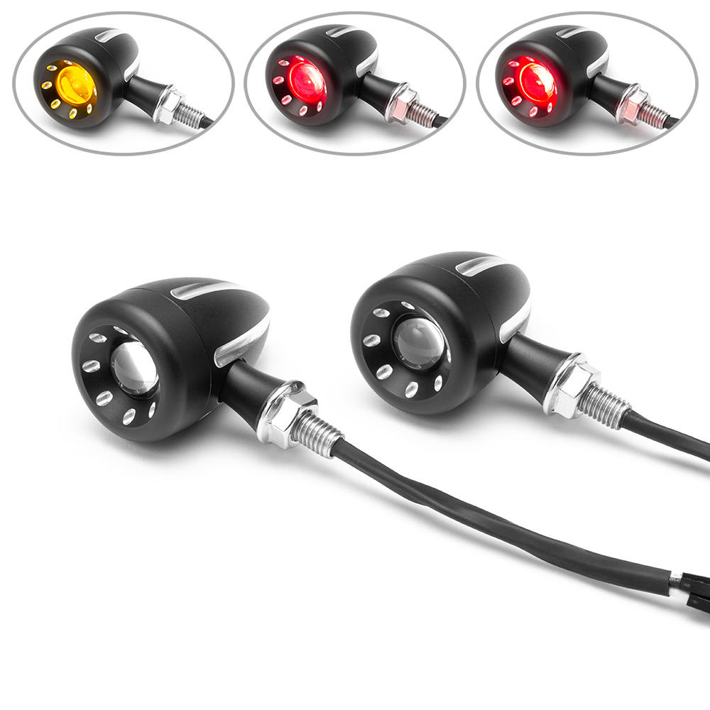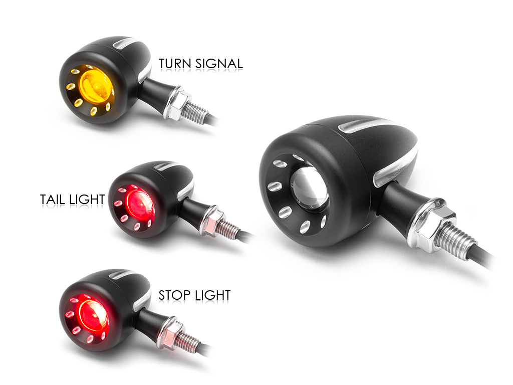 Deze geïntegreerde LED-richtingaanwijzers zijn CNC-gefreesd, superhelder en zijn van zeer hoge kwaliteit. Ze combineren alle functies die nodig zijn voor de achterkant van uw motorfiets verpakt in een alles-in-een kleine en discrete aangepaste behuizing. Ze beschikken over een Super Bright Dual Color 3w Cree LED-chip en een projectorlens die het licht vergroot. De tweekleurige LED verandert van kleur tussen functies - Amber LED voor richtingaanwijzers en 2-traps rode LED voor uw stop- en achterlichten. Deze geïntegreerde richtingaanwijzers zijn ons exclusieve ontwerp en zijn alleen rechtstreeks verkrijgbaar via Max Inc en onze geselecteerde dealers.