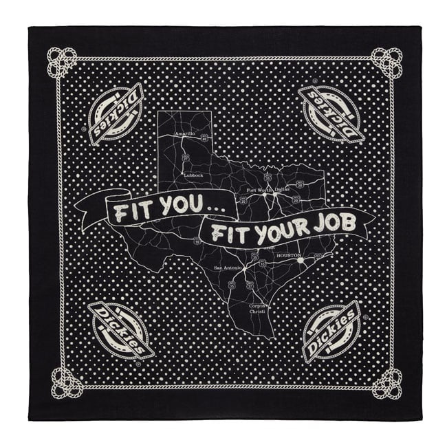 De Dickies Slayden Bandana is een grote bandana van 68 x 68 cm met authentieke Dickies-details en -afwerking. Gemaakt van 100% katoen, is hij voorzien van klassieke bandana-afbeeldingen met een kaart van Texas, de tekst 'Fit You… Fit Your Job' en een bijpassend label in de rand. Een tijdloze en functionele bandana, ontworpen voor elke klus.