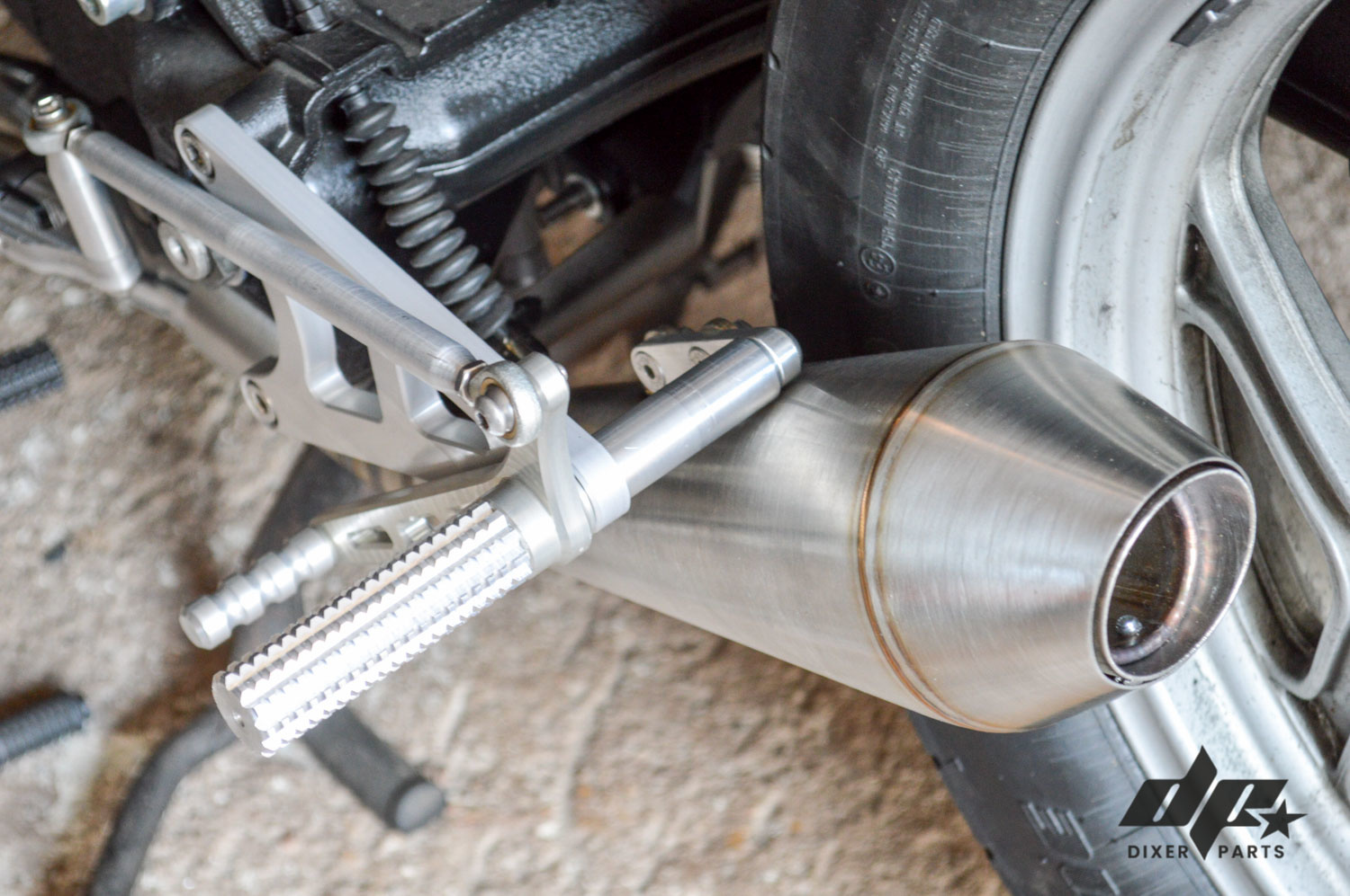 De motor heeft een zeer aantrekkelijk uiterlijk dankzij de roestvrijstalen uitlaatdemper. Doordat de hoek is aangepast aan de lijn van de brandstoftank, ziet hij er heel mooi uit. Er kunnen meer gaten in de Db-killer worden geboord om het uitlaatvolume te vergroten. Voor de routine technische keuring adviseren wij montage van de Db-killer omdat de uitlaat niet TUV-gecertificeerd is. Accessoire-uitlaat klaar om te passen op alle BMW K75-modellen.