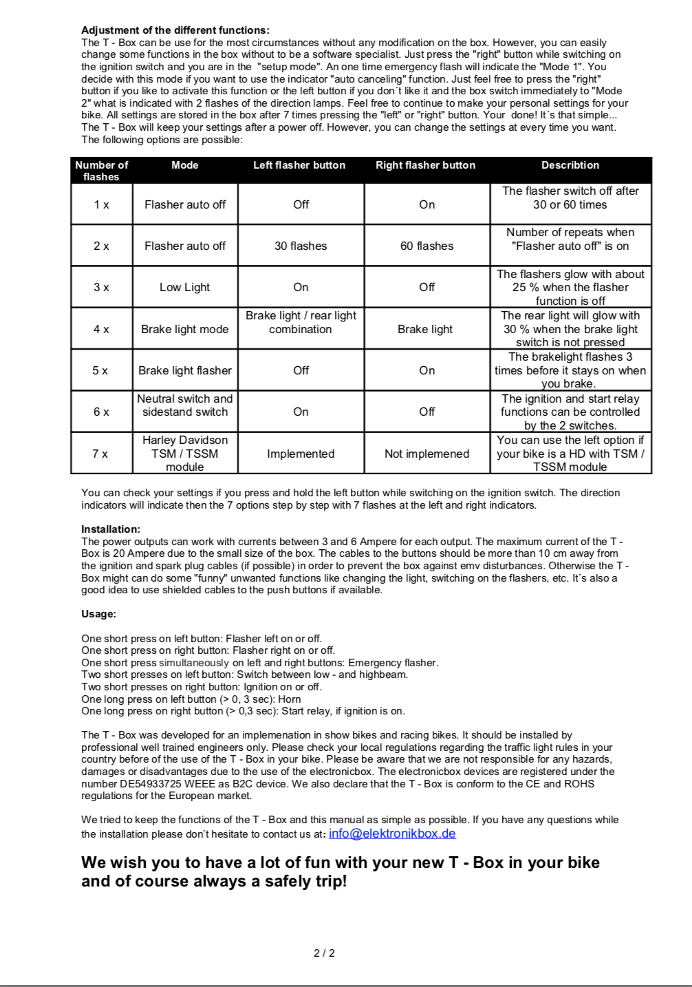 U kunt de verschillende functies van de T-Box op elk moment wijzigen. Voordat u het contact inschakelt, drukt u op de linkerknop en houdt u deze ingedrukt tot het contact aanstaat. Na het loslaten van de knop bevindt u zich in de programmeermodus. Een enkele knipperende waarschuwing geeft de programmeermodus aan. Door op de linker of rechter knipperlichttester te drukken, kunt u nu bijvoorbeeld de comfort knipperfunctie in- of uitschakelen, zoals weergegeven in onderstaande tabel. Dan kom je automatisch op het volgende punt in het programma. Je "hangt" dan door alle programmapunten en maakt je persoonlijke instellingen.