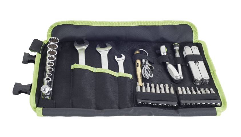 Deze 32 delige gereedschapstas GIRA is ideaal voor onderweg. Bevat veel gebruikte gereedschappen voor kleine reparaties. Handig voor onderweg, door praktisch opgeborgen gereedschap in compacte foudraal.