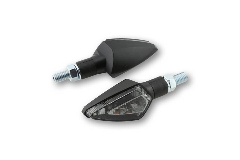 Moderne 3-in-1-indicator in pijlpuntvorm met zwarte plastic behuizing en licht getinte lens. Innovatieve lichttechnologie met zeer heldere SMD-LED's. In het midden van het verlichte gebied is de richtingaanwijzer en in de buitenruimte in V-vorm het duidelijk zichtbare achterlicht. Deze stijlvolle 3-in-1-indicator heeft een aangenaam formaat, niet te groot en niet te klein.