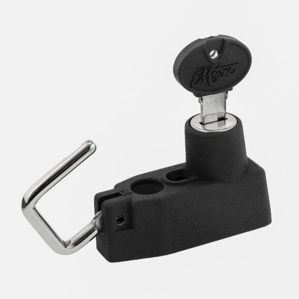 Motone Helmslot + 2 Sleutels gemaakt van gegoten aluminium met zwarte poedercoating. Het slot en de sleutels zijn gemaakt van roestvrij massief staal.