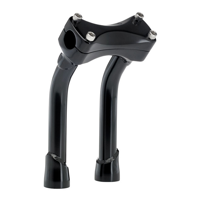 Verchroomd/Zwart. TUV goedgekeurd. Met 5,1 cm terugvering. Voor 25,4 mm-stuur. Gemaakt van gegoten staal bovenste en schroefdraad lager. De stijgbeugelbuizen zijn TIG-gelast naadloos 4130 chromoly met 3mm dik buizenstelsel en 1/2-13 ingepaste opzettende gaten die voorraadstijgbeugelbouten zullen nemen. De tussenruimte is 89 mm, zodat de meeste H-D top triple bomen passen. Het bovenste klemmenpatroon is geschikt voor de standaard H-D snelheidsmeter en toerentellersteunen.
