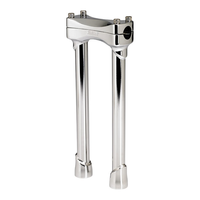 Voor 1" (25.4mm) stuur. Gemaakt van gegoten staal bovenste en schroefdraad lager. De stijgbeugelbuizen zijn TIG-gelast naadloos 4130 chromoly met 3mm dik buizenstelsel en 1/2-13 ingepaste opzettende gaten die voorraadstijgbeugelbouten zullen nemen. De tussenruimte is 89 mm, zodat de meeste H-D top triple bomen passen. Het bovenste klemmenpatroon is geschikt voor de standaard H-D snelheidsmeter en toerentellersteunen.