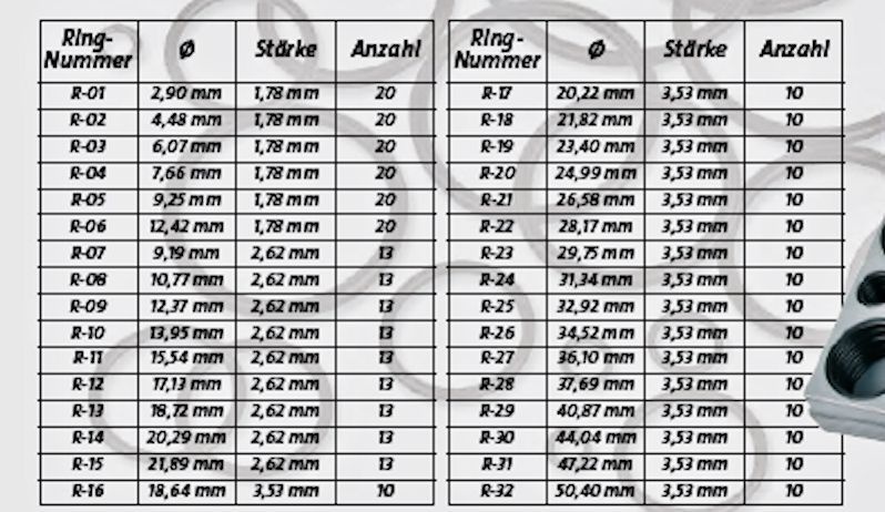 Mannesmann Assortimentdoos met 407 O-ringen in 32 verschillende maten. De ringen zijn bestand tegen temperaturen van -20 ¼ tot + 120 ¼ C en zijn water- en oliebestendig. De O-ringen lopen in maat op van 2,90 mm (dikte 1,78 mm) tot 50,40 mm (dikte 3,53 mm).