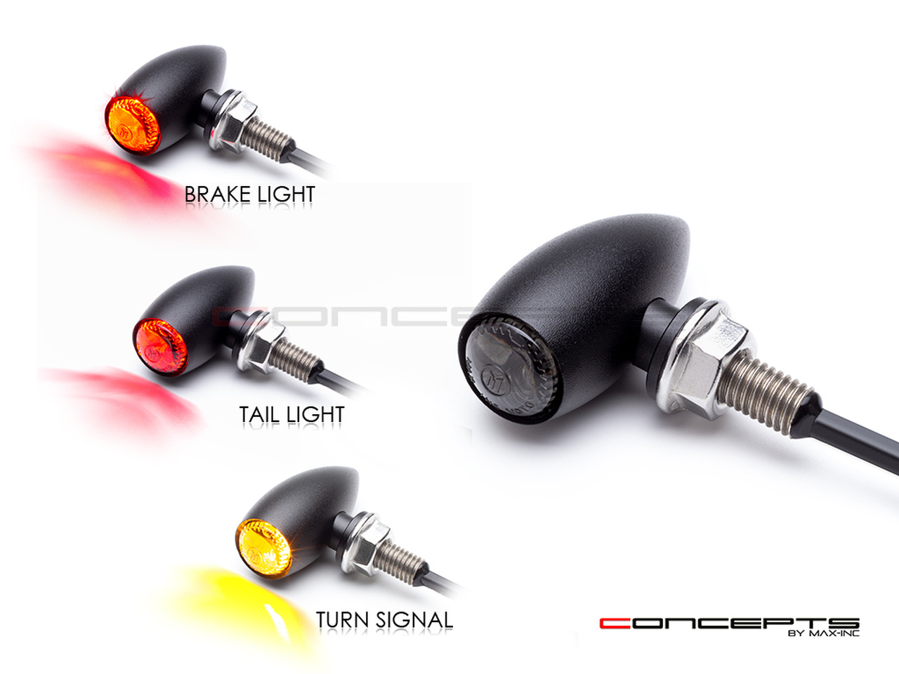 Deze geïntegreerde LED richtingaanwijzers zijn CNC gefreesd, super helder en super klein. Zij combineren alle functies nodig voor het achtergedeelte van uw motorfiets in een alle-in-één uiterst kleine huisvesting. Zij kenmerken een Super Heldere Dubbele Kleur LED Chip die door een projectorlens wordt bedekt die het licht vergroot. De Dual Colored LED verandert van kleur tussen de functies - Amber LED voor richtingaanwijzers en 2 stage rode LED voor uw rem-en achterlichten. Deze Geïntegreerde richtingaanwijzers zijn ons exclusief ontwerp en zijn slechts beschikbaar direct door Max Inc en onze geselecteerde handelaars.