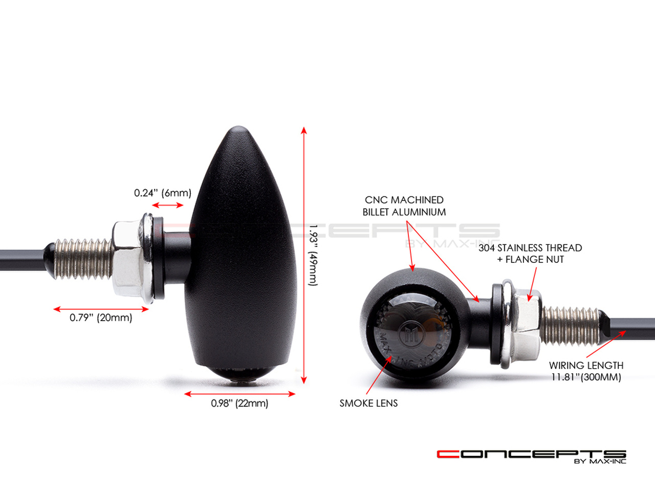 MAX CONCEPTEN "PROTON" ZWART CNC GEFREESD BILLET ALUMINIUM GEÏNTEGREERDE LED RICHTINGAANWIJZERS