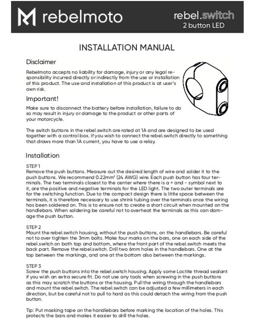 Elke behuizing heeft twee kortstondige drukknoppen die zijn ontworpen om te worden gebruikt in combinatie met een bedieningskast, zoals de m-Unit van Motogadget en kan worden gebruikt voor het besturen van richtingaanwijzers, lichten, starter, claxon en alles wat u maar kunt bedenken. De drukknoppen hebben een vermogen van 1A en zijn IP65, wat betekent dat ze bestand zijn tegen regen en stof. De rebel.schakelaar is aan het stuur bevestigd met behulp van twee roestvrijstalen bouten van 3 mm, die natuurlijk zijn inbegrepen.