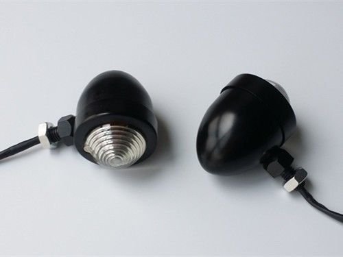 Set Oldskool Black & Transparant Bullet Knipperlichten in een zwarte behuizing.