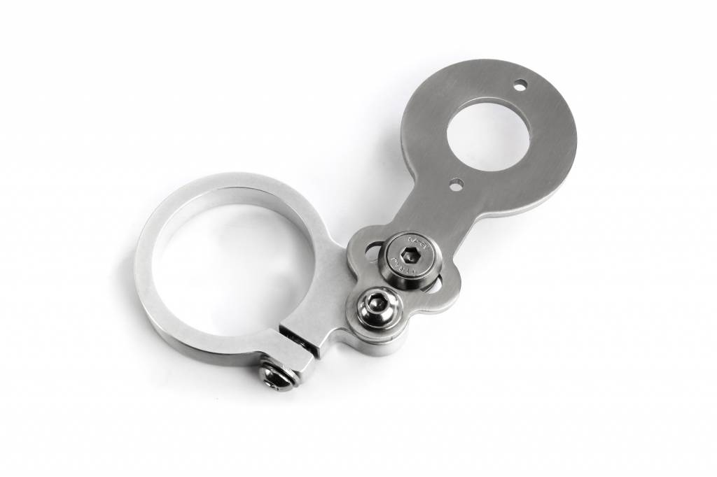 Verwijder eerst de kroon van de bovenste vork door de schroef van de stuurkop en de klemschroeven aan de zijkant los te draaien. Duw nu de snelheidsmeterhouder Two Hands Motorcycles over een van de twee standpijpen.
