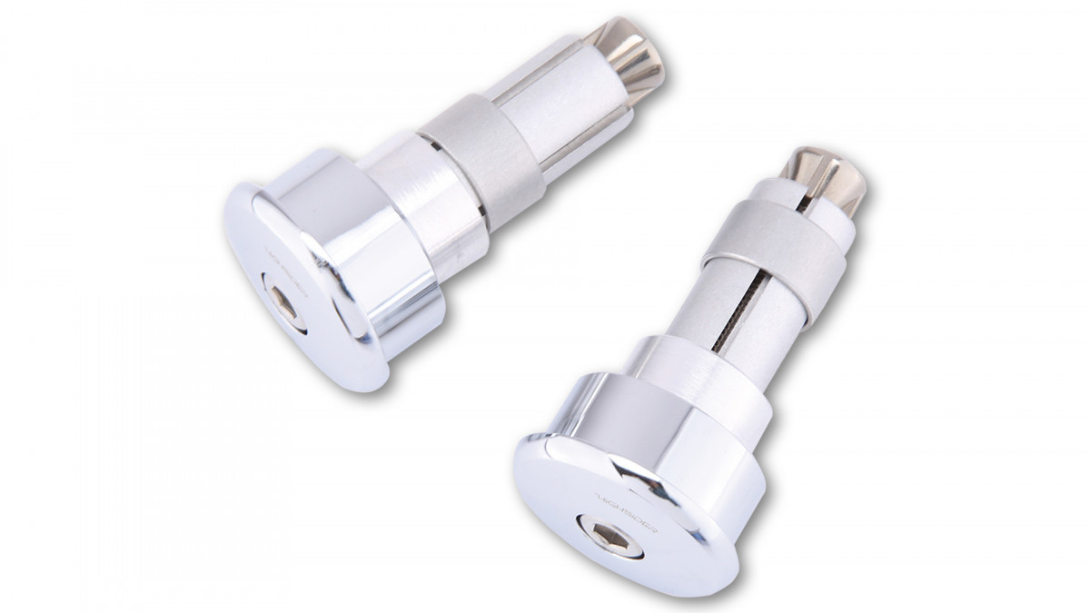 Stuurgewichten van verchroomd of zwart aluminium met verchroomde of zwarte centrale schroef. Universeel toepasbaar voor sturen met een binnendiameter van 12 tot 22 mm - dus voor de meeste 7/8 inch en 1 inch aluminium of stalen sturen. Alle hangende staafeindspiegels van het merk HIGHSIDER en SHIN YO kunnen met externe klemmen worden gemonteerd.