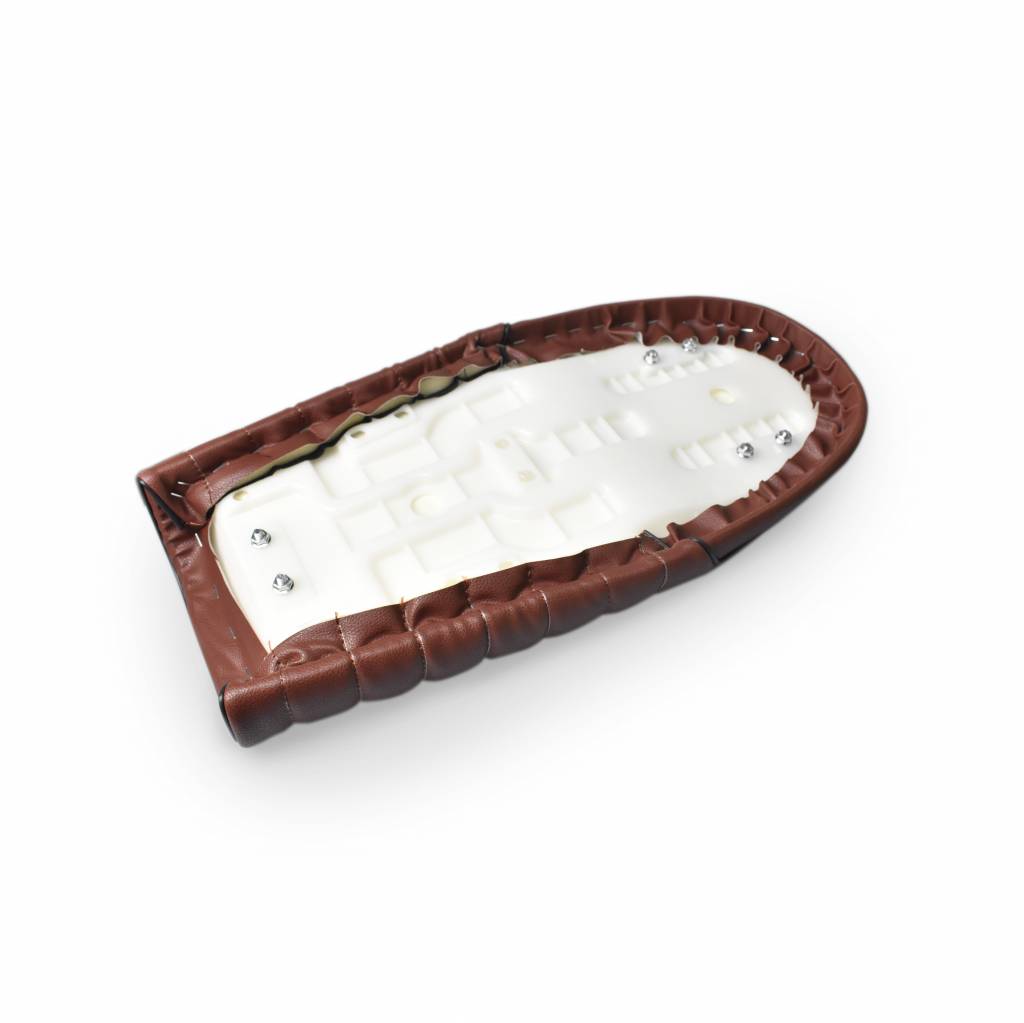 De zitjes zijn bekleed met kunstleder omdat dit beter tegen water en zonlicht kan. Leder verkleurt sneller en is niet zo "droog" als u gaat rijden na een regenbui. Zodoende zie ook dat praktisch alle productie motoren een kunst leder (skai) zitje hebben.