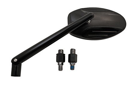 Glanzend zwarte stuurspiegel van aluminium. De spiegel is voorzien van fijne, gefreesde groeven in de ovale kop voor een mooi visueel effect. De stuurpen is voorzien van een scharnier voor verdere verstelbaarheid en optimaal zicht naar achteren. Geschikt voor zowel de linker- als rechterzijde van het stuur. Inclusief een extra adapter met M10 x 1,25 mm L/H-draad voor Yamaha.