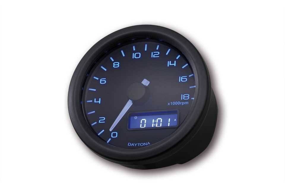 Daytona Velona Tacho Black 18.000 RPM. DAYTONA digital tachometer VELONA, black housing, diameter 60 mm, up to 8,000 rpm, bracket included, blue backlight illumination. Functions: highest rpm memory, oil / water temerpature, clock. The signal is picked up from the original Tachometer cable. Other input options: dirctly from the ignition coil or inductiv from the spark cable.