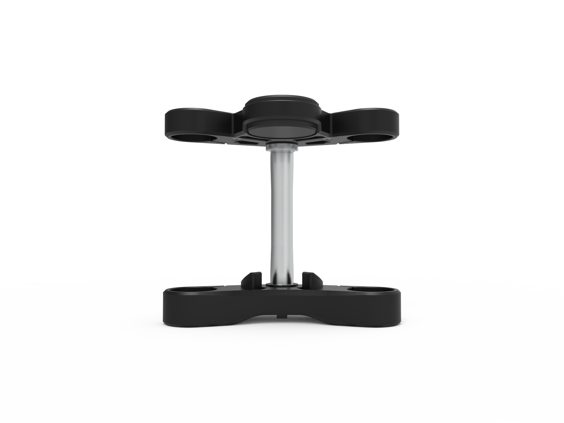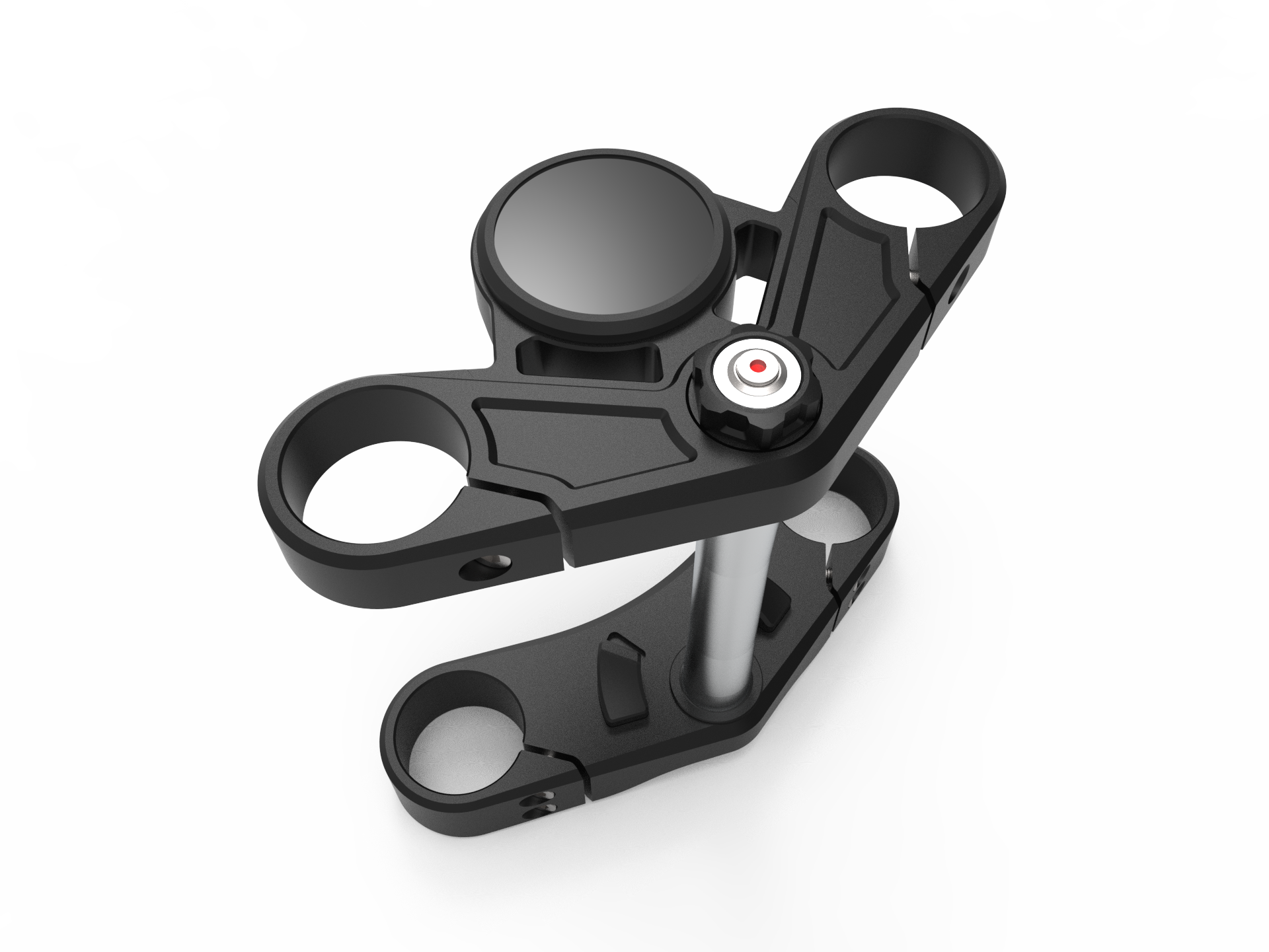 - Volledig aluminium triple tree geanodiseerd in zwart met verstelbare stuuraanslagen en bevestiging voor remleidingsplitter