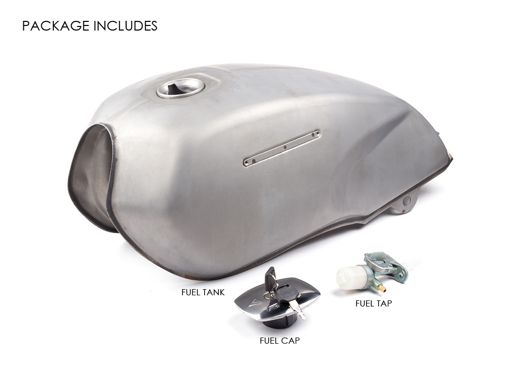 Hoogwaardige universele vintage stijl brandstoftank. Wordt compleet geleverd met tankdop en sleutels en brandstofkraan.