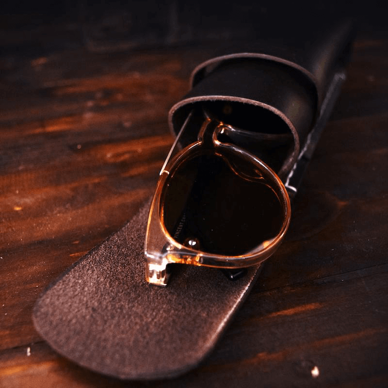 Berg je bril op in stijl. De lederen zonnebrilhoes zorgt ervoor dat je fijne smaak niet verloren gaat. De behuizing is uitsluitend gemaakt van stevig harnasleer, is ruw, robuust en zorgt ervoor dat uw bril veilig en solide is.